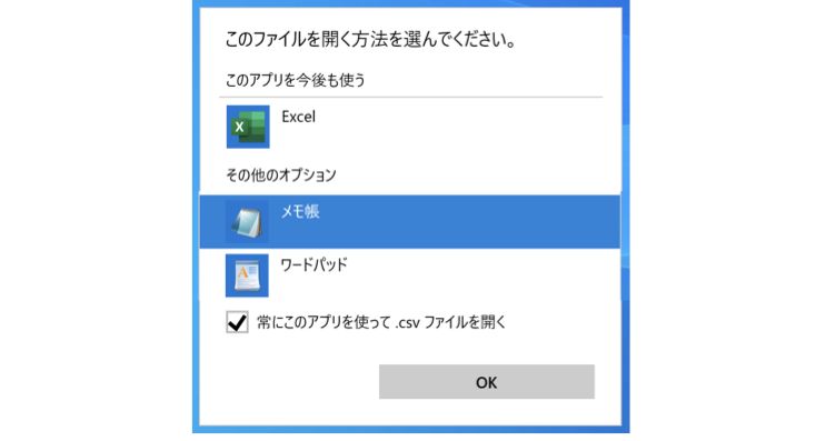 そこで「メモ帳」などのエディタを選び、「常にこのアプリを使って .csv ファイルを開く」にチェックを入れて「OK」すると、今後ダブルクリックしてもExcelは起動しなくなります。