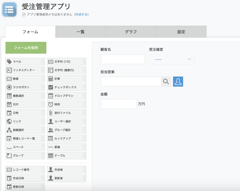 今回、フルスクリーンプラグインで表示したい情報は「顧客名」、「受注確度」、「担当営業」、「金額」の4つの項目です。そのため、内容に沿ったアプリを作成します。