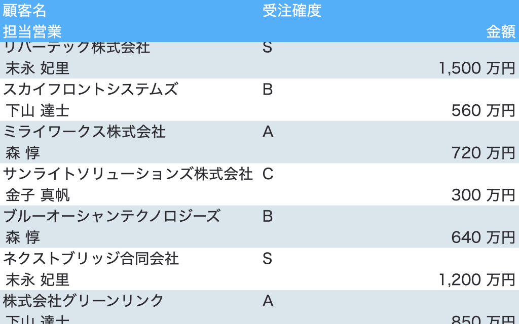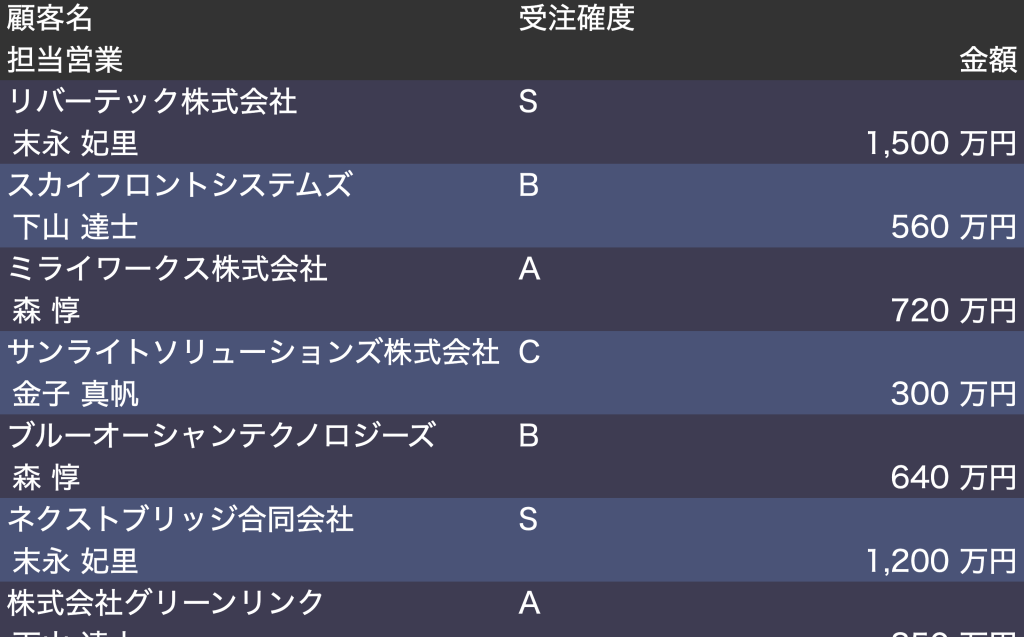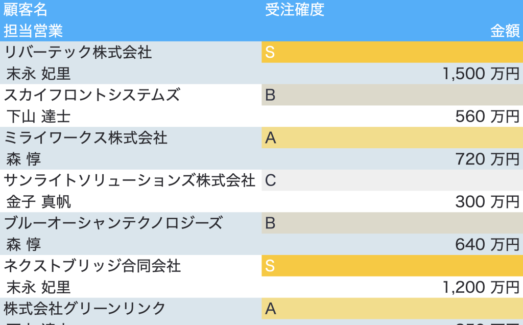 これだけでも十分便利ですが、さらに「受注確度」をExcelの条件付き書式のように色分けできれば、ひと目で状況を把握しやすくなると思います。