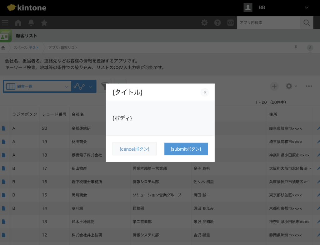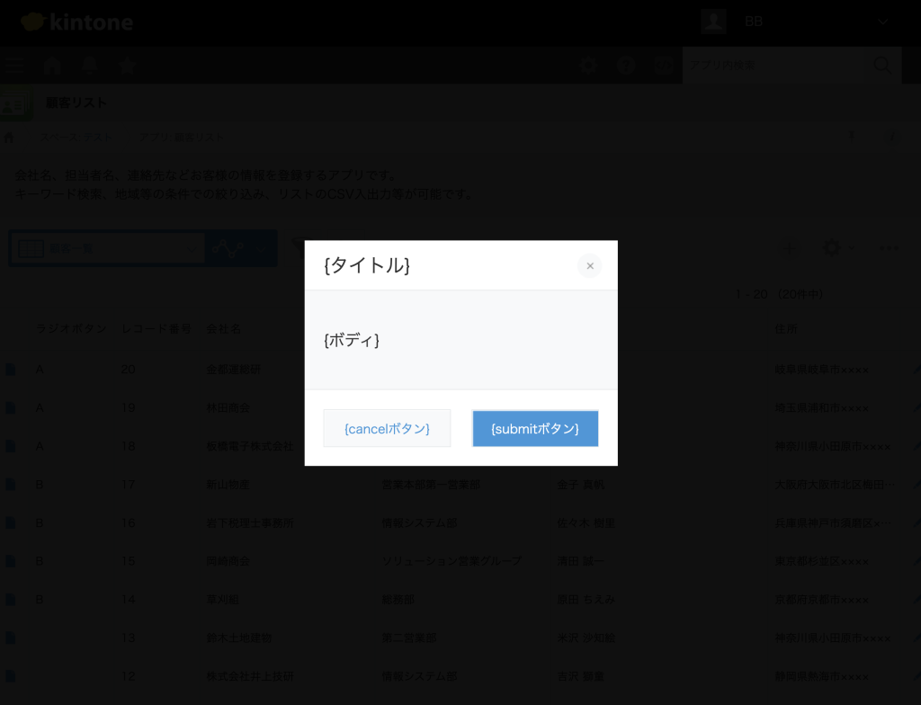 kintoneライクな「確認ダイアログ」を表示することができるAPIです。このダイアログが表示されている間はkintoneの操作はできないようになっています。(が、ショートカットキーは動きました・・・これは2025年11月のアプデに期待ですな)
