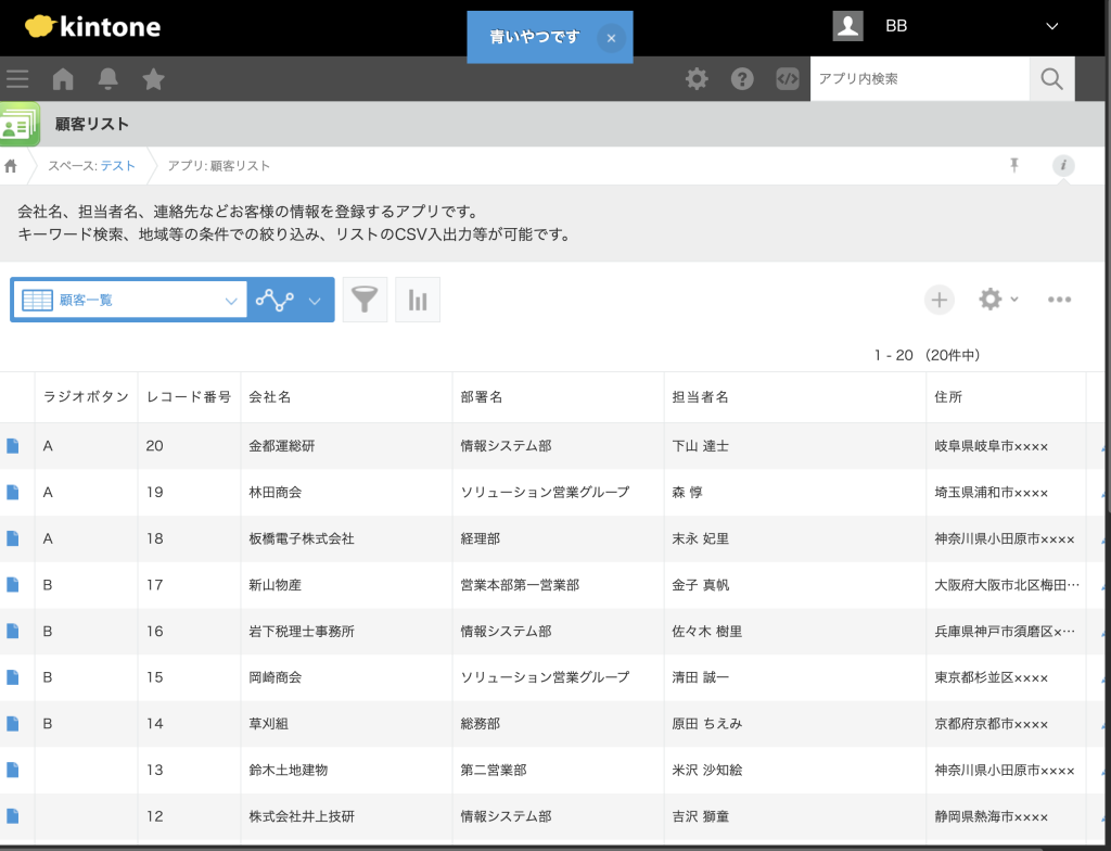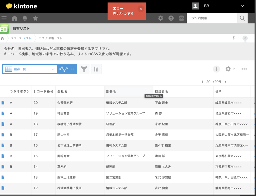 // 赤いやつ kintone.showNotification('ERROR', '赤いやつです'); // 緑のやつ kintone.showNotification('SUCCESS', '緑のやつです'); // 青いやつ kintone.showNotification('INFO', '青いやつです');