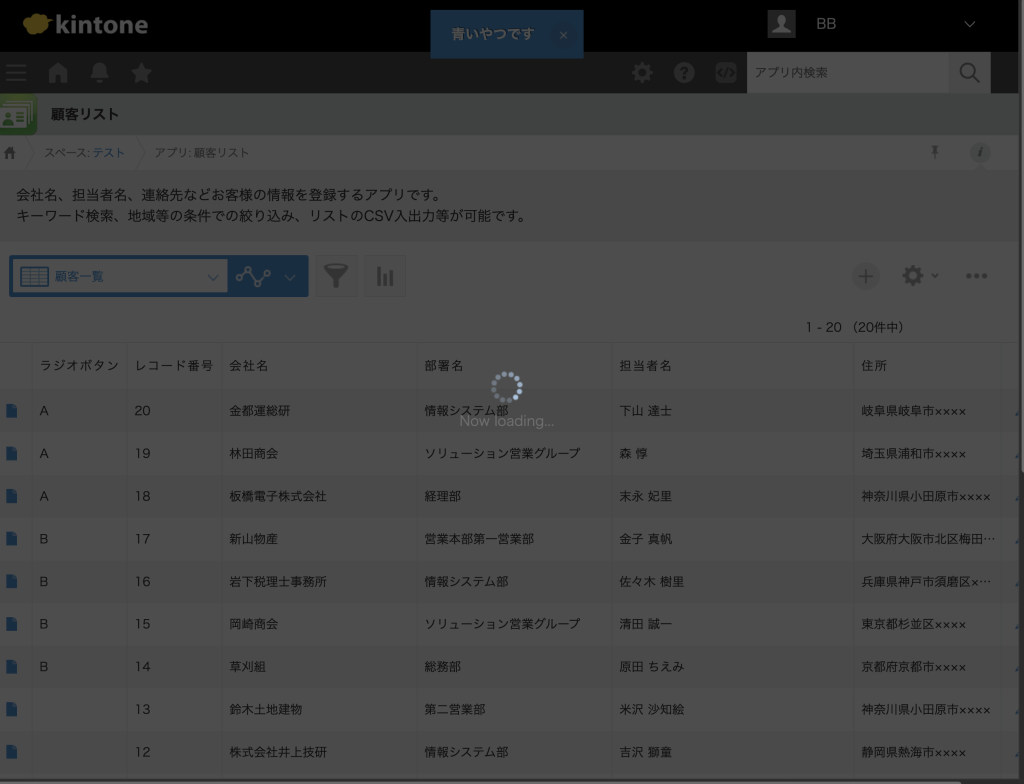 // ローディングの表示 kintone.showLoading('VISIBLE'); // ローディングの非表示 kintone.showLoading('HIDDEN');