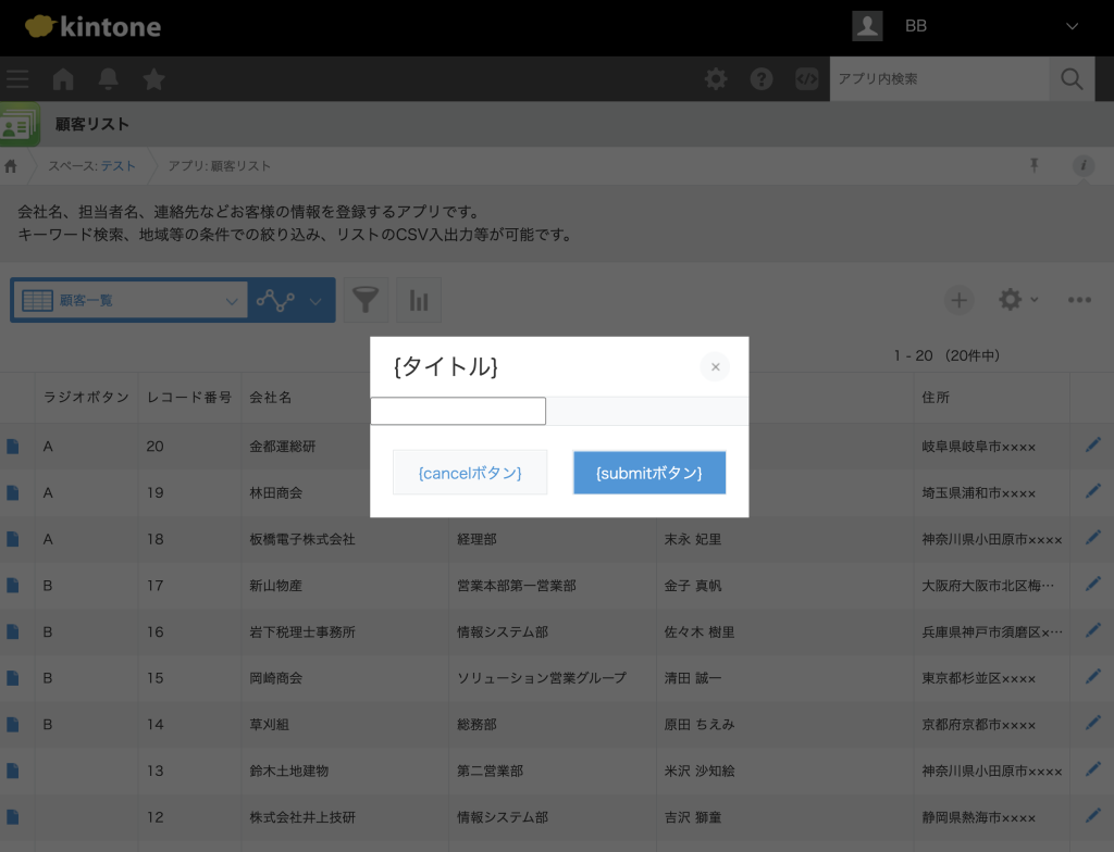 // 不正解) // これだけでは画面には何も表示されない const input = document.createElement('input'); kintone.createDialog({ title: '{タイトル}', body: input, showOkButton: true, showCancelButton: true, okButtonText: '{submitボタン}', cancelButtonText: '{cancelボタン}', showCloseButton: true });