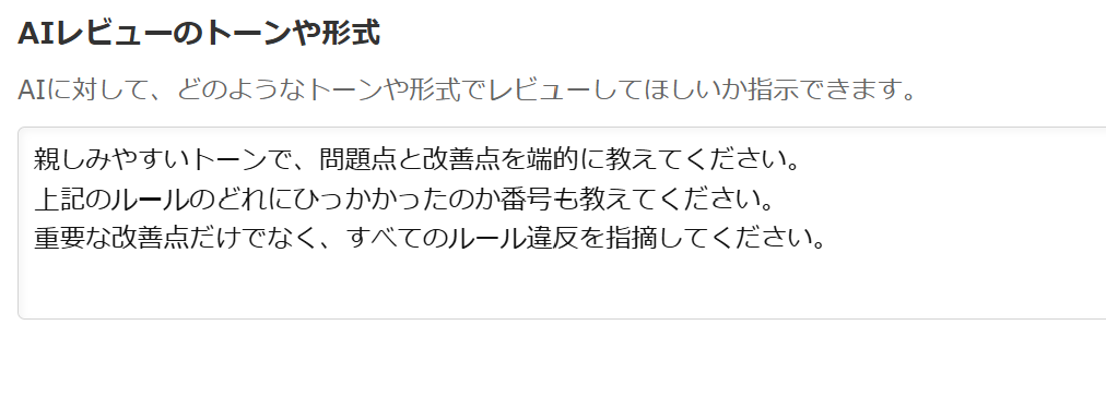 「アプリ設定レビューAI」がレビューを行う際の言葉遣いや形式を指定することができます。
