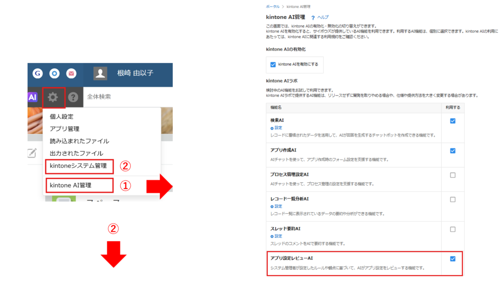▼①システム管理者は、kintone AI管理画面>kintone AIラボ>「アプリ設定レビューAI」にチェックを入れます。