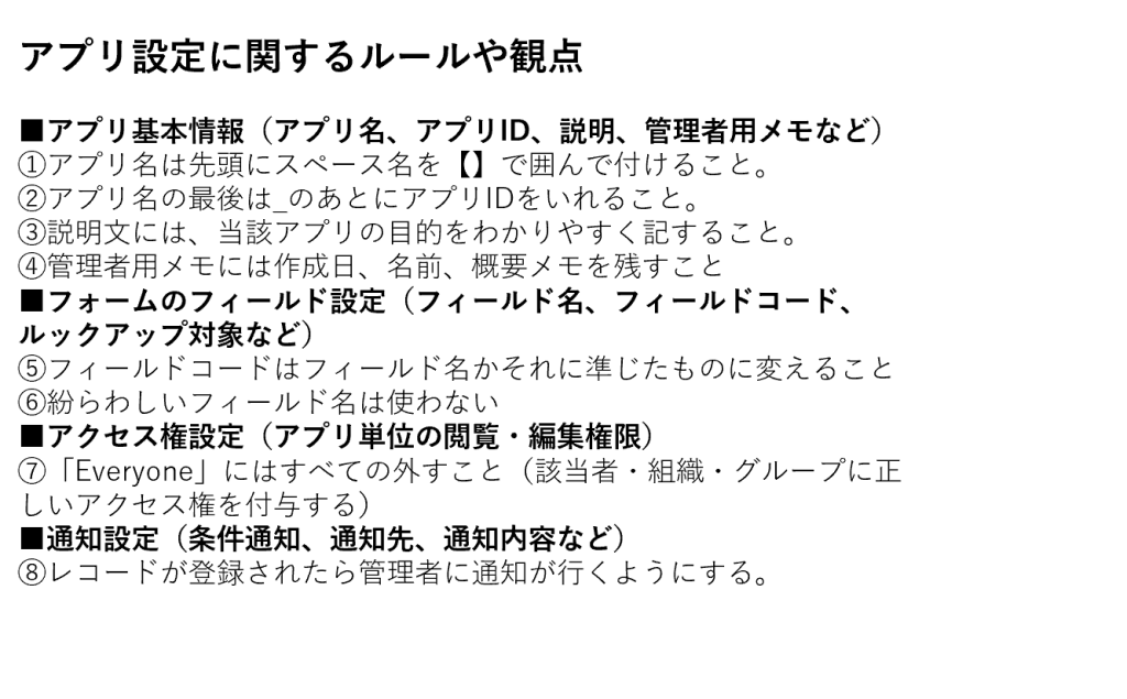 アプリ設定に関して、アプリ作成者やアプリ管理者に守ってもらいたいルールや、より使いやすいアプリにするための観点など、社内のガイドラインを登録します。