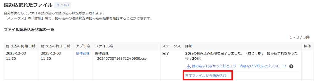 「読み込まれたファイル」画面で、読み込まれなかった行の再読み込みを行うボタンが利用可能に
