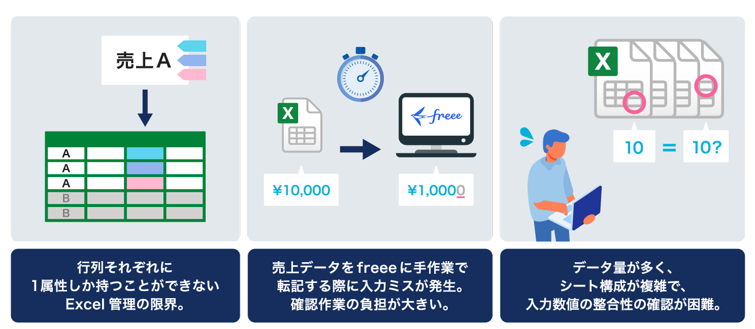 特に経理担当者の請求業務の負担は著しく、数百件の請求先について、Excel生データを手入力した後、会計ソフトfreeeに転記を行い、それからチェック作業、請求書出力と、請求書発行だけでも毎月延べ8時間以上の労力を費やしていました。また、データ量の膨大さと複雑さからチェック漏れも頻発し、売上よりも粗利が大きく入力されるなどの整合性エラーが見過ごされるケースも少なくありませんでした。