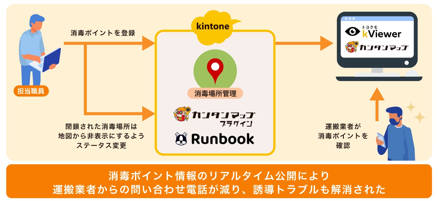 鳥インフルエンザ対応では、kintone上で消毒ポイント情報を登録するだけで「kViewer」を通じてリアルタイムにWeb公開される仕組みに変化、問い合わせにかかるコストを大きく引き下げることができました。消毒済み証明書についても電子化を実施、紙の配布・補充作業が不要となりました。