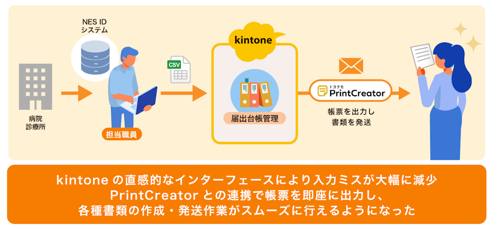 結核患者管理においては、kintoneの直感的なインターフェースにより入力ミスが大幅に減少し、帳票出力サービス「PrintCreator」との連携により必要な帳票を即座に出力できるため、各種書類の作成・発送作業が格段にスムーズになりました。