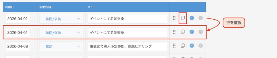 各行に配置されたコピーボタンで、同じ内容の行を即座に増やすことができます。複製するフィールドを事前に指定でき、「活動内容はコピーするが日付は空欄にする」といった細かな制御にも対応。モバイルにも対応しています。