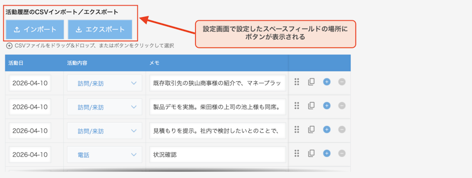 マウス一つのドラッグ操作で行の入れ替えが可能になり、既存行の複製もワンクリック、画面レイアウトを崩さない高さ固定、テーブル単位でのCSVインポート・エクスポート機能により、テーブルフィールドの利便性を向上させます。