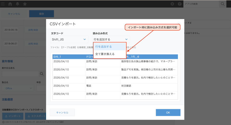 テーブル内のデータだけを専用CSVとして書き出し、外部からインポートすることができます。インポート/エクスポートを利用できるユーザーや組織を細かく制限できる「使用許可設定」も備わっており、権限管理も安心です。